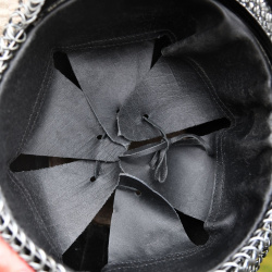 Gefertigt aus stabilem Stahlblech, überzeugt der Helm durch robuste Verarbeitung und authentisches Erscheinungsbild. Die aufwendige Kettenbrünne aus Stahlringen schützt Nacken und Schultern und ermöglicht gleichzeitig eine gute Beweglichkeit des Kopfes. Diese Kombination aus Helm und beweglichem Kettengeflecht war in der Wikingerzeit eine besonders effektive Schutzlösung.