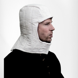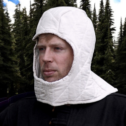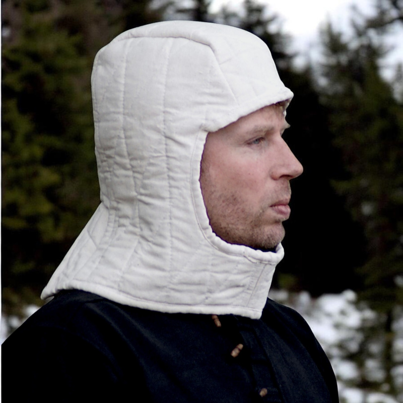 Diese stark gepolsterte mittelalterliche Kopfhaube in Natur ist die ideale Unterziehhaube für Helm oder Kettenhaube. Mit ca. 6 mm Materialstärke und mehrlagigem Aufbau bietet sie optimalen Schutz und hohen Tragekomfort.