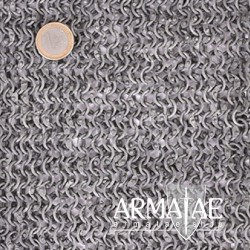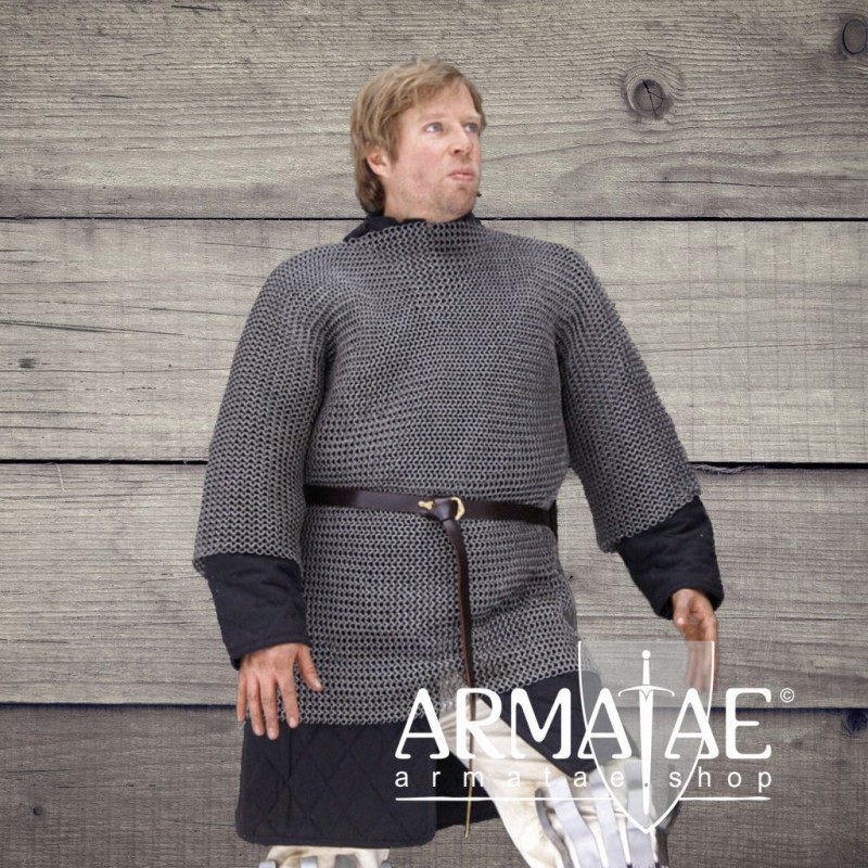 Haubergeon - Kettenhemd, welches in etwa bis zum Oberschenkel reicht und halblange Ärmel besitzt. Gefertigt aus vernieteten ID 8 mm Aluminium-Rundringen, 1,6 mm stark, mit dunkelgrauer Stahloptik.
