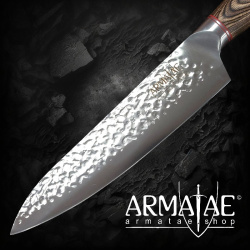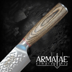 Unsere Armatae 4CR15MOV Messerserie zeichnet sich durch die Hammerschlag Schmiedung mit nahtlos angefügtem, ergonomisch gestalteten Pakkawood-Holzgriff aus, eine gelungene Symbiose, welche ein sehr angenehmes Arbeiten in der Küche ermöglicht.