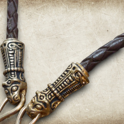 Die geflochtene Lederkette mit Tierkopf-Endstücken basiert auf einem Fund aus dem Schatz von Mandermark auf der Insel Møn in Dänemark, der in das 10. Jahrhundert datiert wird. Die Endstücke sind in Form stilisierter Tierköpfe gestaltet, die einen Anhänger zwischen ihren Mäulern halten – ein typisches Motiv nordischer Schmuckkunst dieser Zeit.