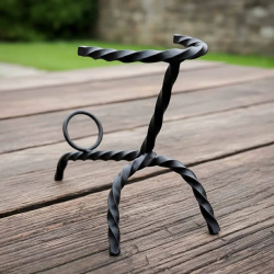 Dieser handgeschmiedete Wikinger Trinkhornständer aus Eisen überzeugt durch stabile Bauweise und authentisches Design. Mit verdrehten Armen und Dreibein-Konstruktion ist er ideal zur stilvollen Präsentation von Trinkhörnern bei Reenactment, LARP oder als Dekoration.